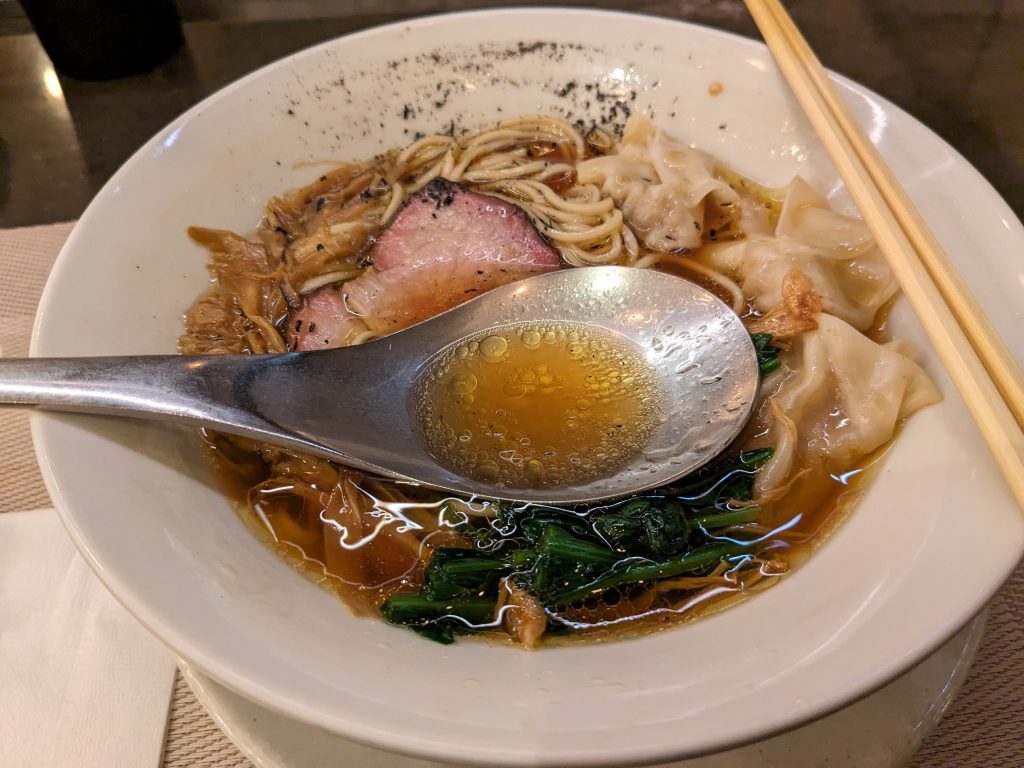 雲呑、チャーシュー、メンマ、ネギ、何かを揚げたカリカリしたやつも入ってました。