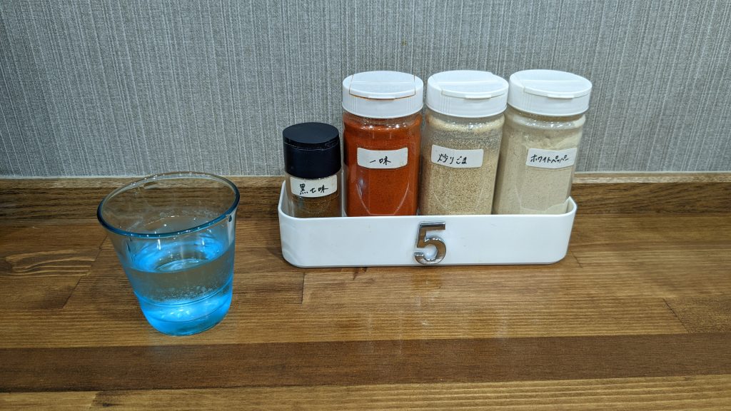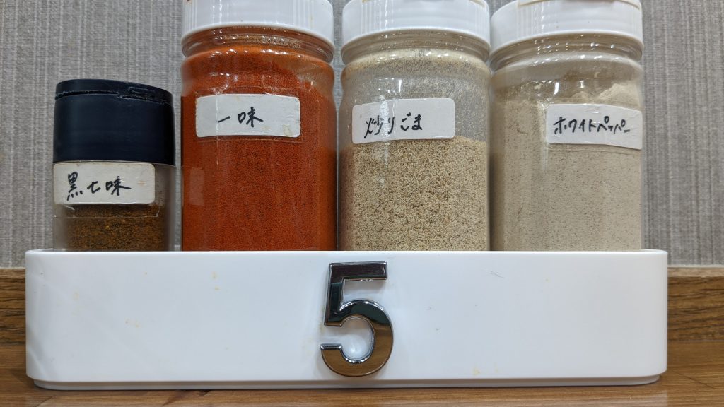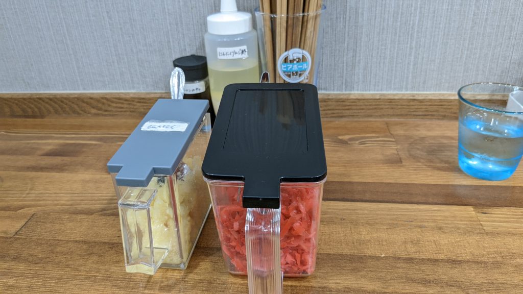 卓上には黒七味、一味、炒りごま、ホワイトペッパー、にんにく、紅生姜、