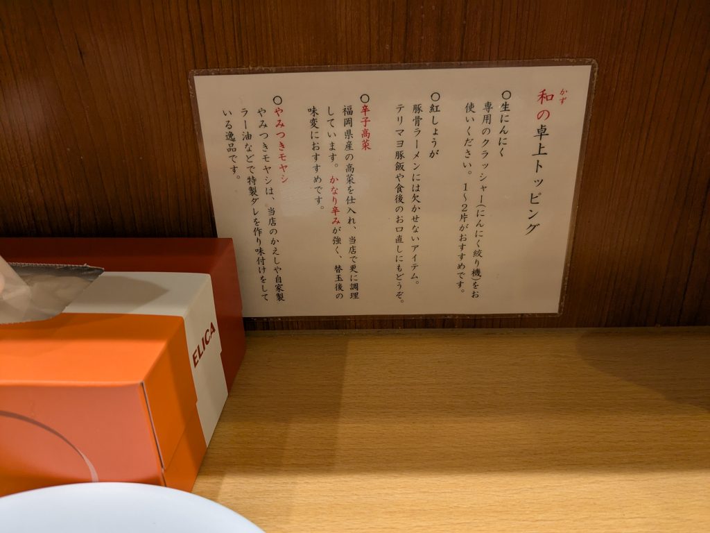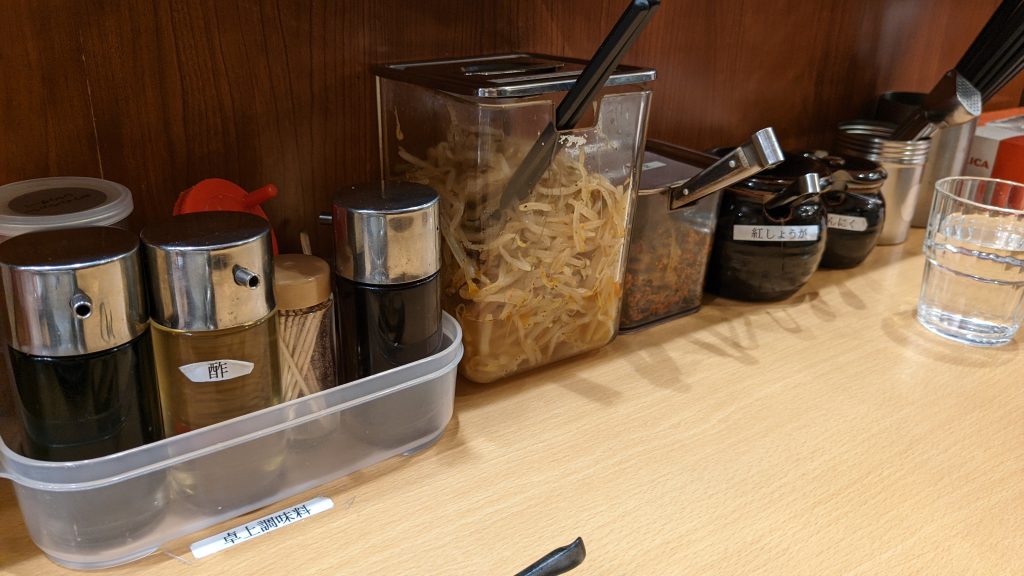 席にはゴマ、高菜、紅生姜、コショウ、モヤシ、ニンニクと一通り揃っています。