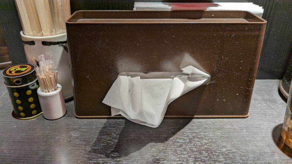 カウンターにはティッシュ、紙エプロンが置いてあります。