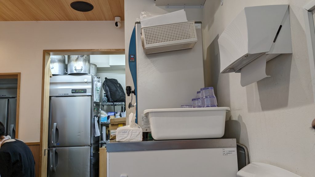 水とティッシュ、紙エプロンはカウンターの後ろにあります。