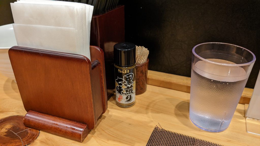 食べすすめて行くと物足りなさがあり、卓上の七味を投入。