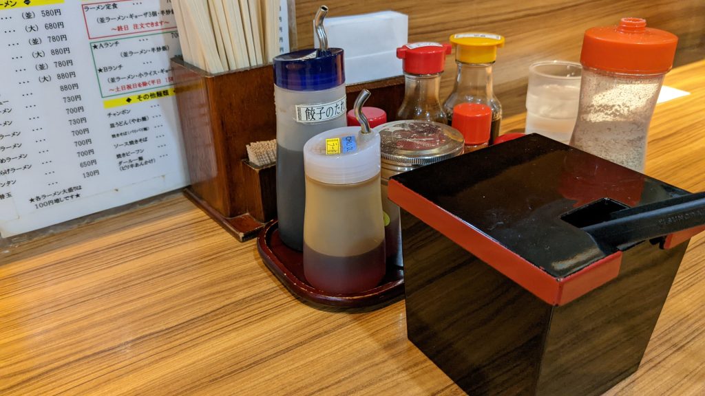 卓上にはラー油、紅生姜、ゴマ、胡椒、一味が置いてありました。