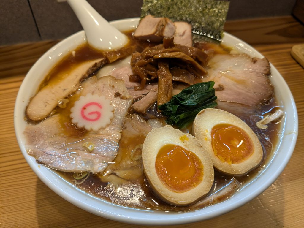 しょうゆチャーシューメン大盛1650円味玉120円小ライス130円を注文。