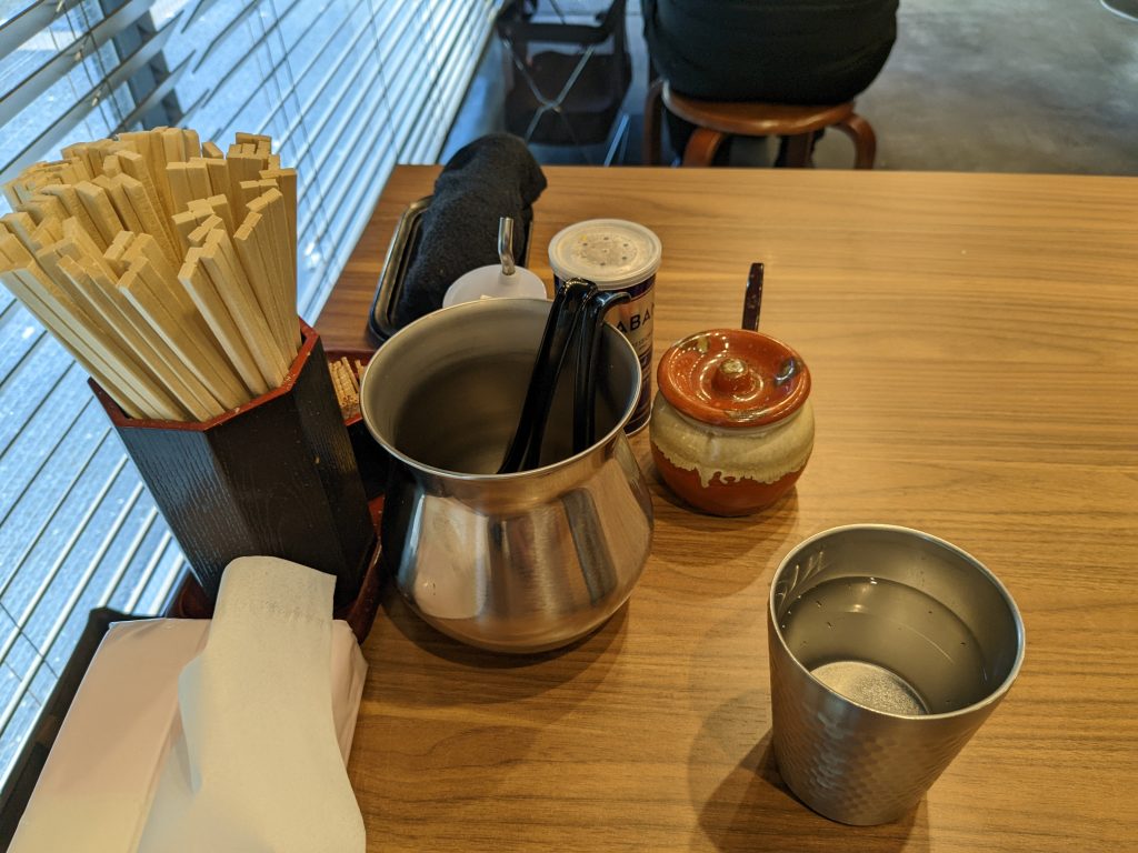テーブルには胡椒、酢、一味唐辛子が置いてありました。