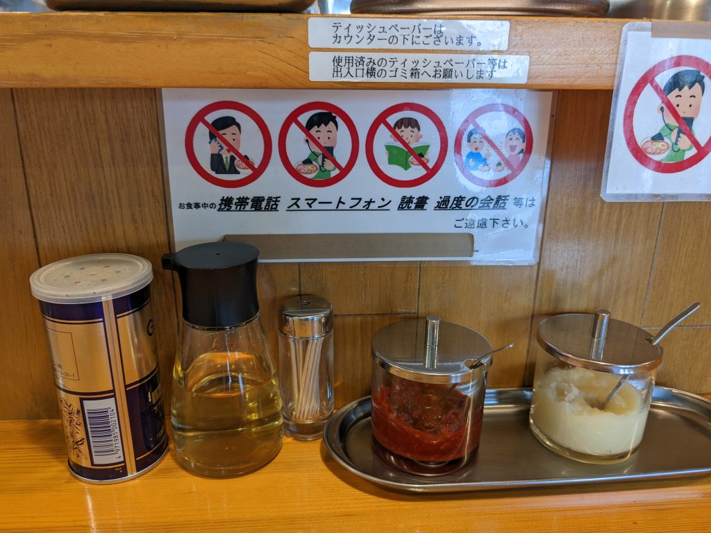 卓上には胡椒、酢、唐辛子、ニンニクがあります。