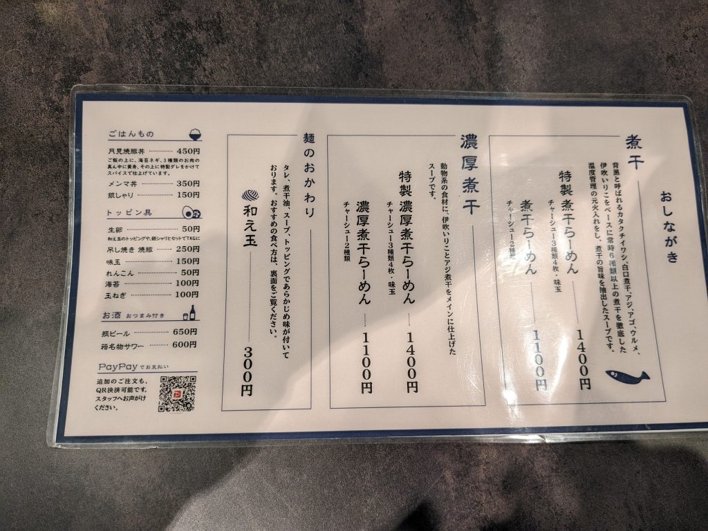 • 主なメニュー:煮干らーめん(1100円)、特製煮干らーめん(1400円)、濃厚煮干らーめん(1100円)、特製濃厚煮干らーめん(1400円)、和え玉(300円)など