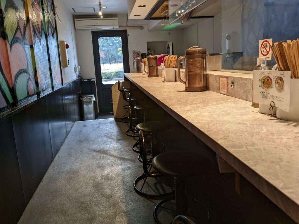 店内はカウンターのみでカウンター下にテッシュ、背面にハンガーがありました。