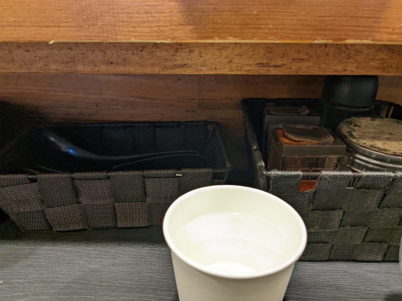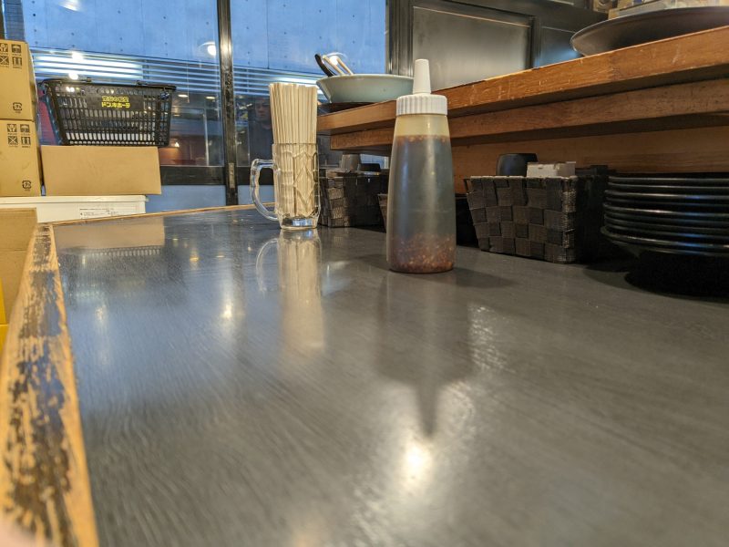 カウンターには胡椒や一味、箸、蓮華が置いてあります。