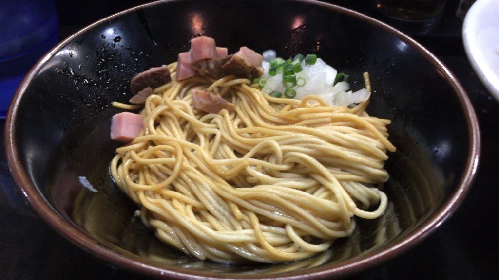 半分食べたら現金250円をカウンターに置いて醤油和え玉250円を頼みました。